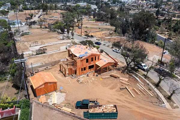 산불 피해 지역에서 주택 공사가 진행중이다. 스테드패스트 LA 웹