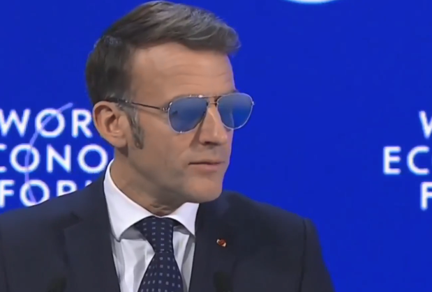 세계경제포럼 무대에서 선글라스를 착용한 채 발언 중인 에마뉘엘 마크롱 프랑스 대통령. 도널드 트럼프 전 대통령을 겨냥한 발언이 화제가 됐다.사진 출처: X @EdKrassen