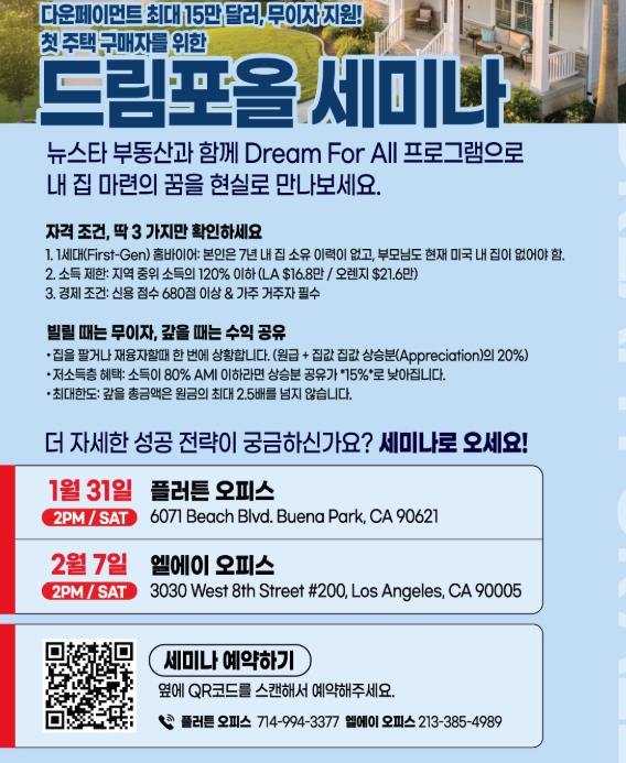 이와 관련해 뉴스타 부동산은 드림 포 올 프로그램 이해와 추첨 대비 전략을 설명하는 설명회를 연다. 프로그램 신청 기간이 2026년 2월 24일부터 3월 16일까지로 짧은 만큼, 사전 융자 승인과 서류 준비를 조기에 마치는 것이 중요하다는 설명이다.