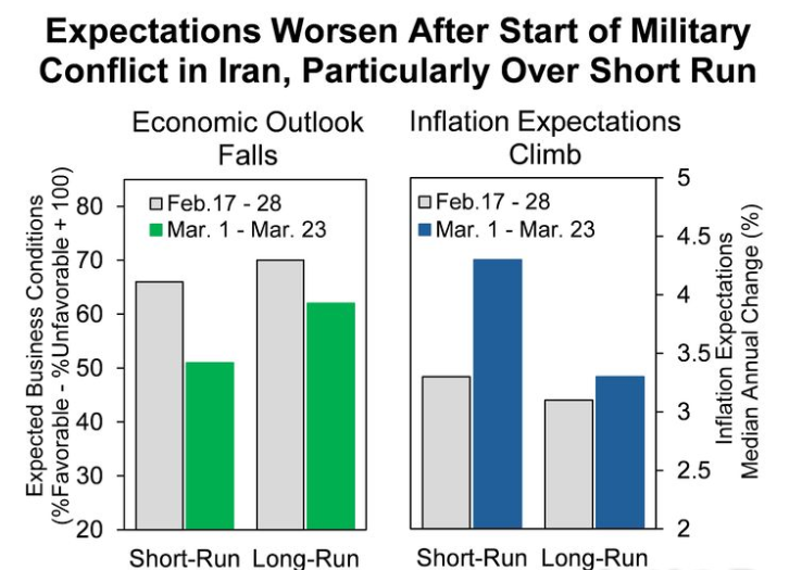 이어 “다만 장기 기대치의 하락폭은 상대적으로 완만했는데, 이는 소비자들이 현재의 부정적 상황이 먼 미래까지 지속되지는 않을 것으로 보고 있음을 시사한다”며 “하지만 이란 전쟁이 장기화되거나 에너지 가격 상승이 전체 물가로 전이될 경우 이러한 견해는 바뀔 수 있다”고 했다.
