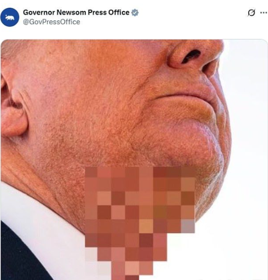 캘리포니아 주지사 개빈 뉴섬이 소셜미디어 X(엑스, 옛 트위터)에 트럼프 대통령의 사진에 모자이크 처리를 한 패러디 사진을 게시하며 조롱했다.