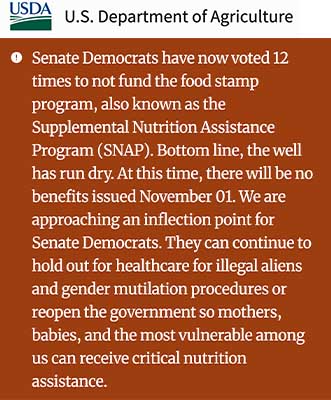 USDA는 최근 공지문에서 “우물의 물이 말랐다”며 “셧다운이 계속될 경우, 11월 SNAP 지급은 불가능하다”고 밝혔다.