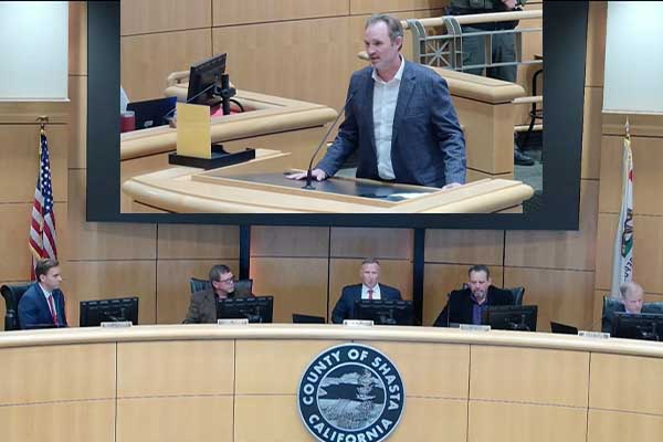 제임스 갤러거 캘리포니아주 하원의원이 샤스타카운티 수퍼바이저 위원회에 출석해 캘리포니아를 두 개의 주로 분리하자는 내용을 설명하고 있다. 샤스타카운티 수퍼바이저 위원회