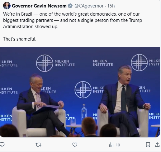 뉴섬 주지사는 10일(현지시간) COP30 개최지인 브라질 벨렝 도착 전 상파울루에서 열린 글로벌 투자자 심포지엄에서 “도대체 무슨 일이 벌어지고 있는지 모르겠지만, 미국 정부 내에서 여러분에게 존중을 보여주는 사람이 아무도 없다는 건 정치 이전에 무례한 일”이라고 말했다.