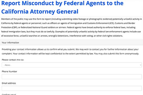 캘리포니아 주민들은 이제 새롭게 개설된 온라인 포털을 통해 연방 요원이나 연방 직원의 불법적이라고 판단되는 행위를 주 전역에서 신고할 수 있게 됐다.