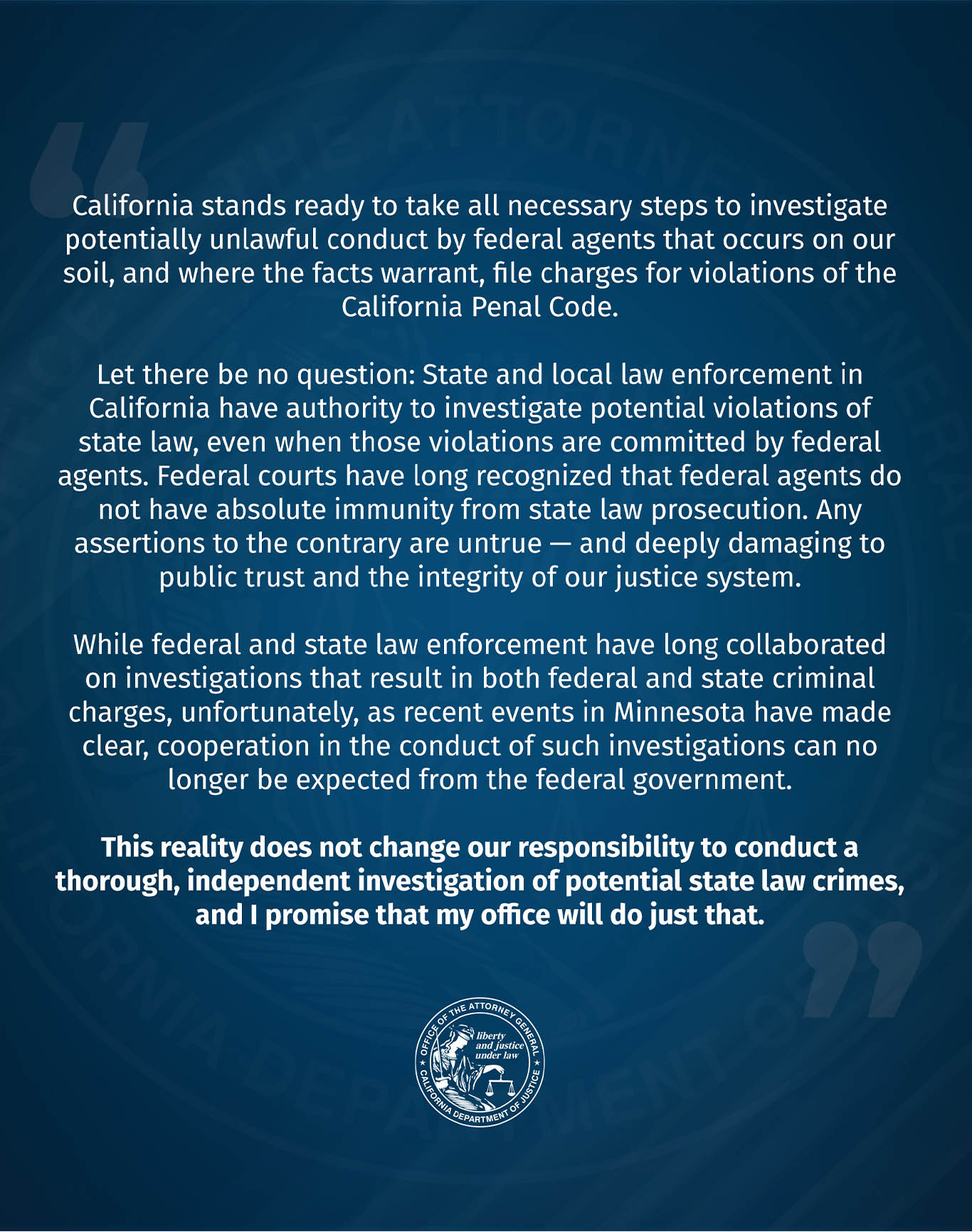 본타 장관은 “캘리포니아는 우리 땅에서 발생한 연방 요원의 잠재적 불법 행위를 수사하기 위해 필요한 모든 조치를 취할 준비가 돼 있으며, 사실관계가 뒷받침된다면 캘리포니아 형법 위반에 대해 기소할 것”이라고 밝혔다. 그는 또 “주 및 지방 법 집행기관은 연방 요원이 저지른 행위라 하더라도 주법 위반 가능성을 수사할 권한이 있다는 점을 분명히 한다”고 말했다.