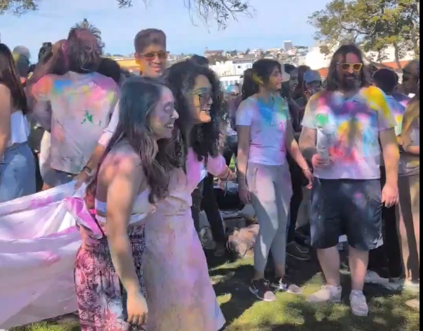 샌프란시스코 돌로레스 파크(Dolores Park)에서 열린 힌두교 전통 축제 **홀리(Holi·색의 축제)**에 참가한 사람들이 서로에게 색가루를 뿌리며 봄의 시작을 축하하고 있다. 사진 X 캡처 (Piyush @42piyush)