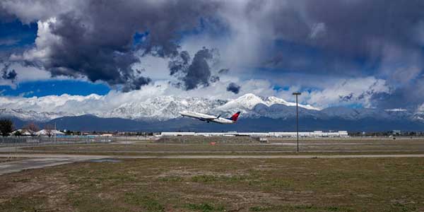 온타리오 국제공항에서 눈덮힌 산을 배경으로 비행기가 이륙하고 있다. 온타리오국제공항