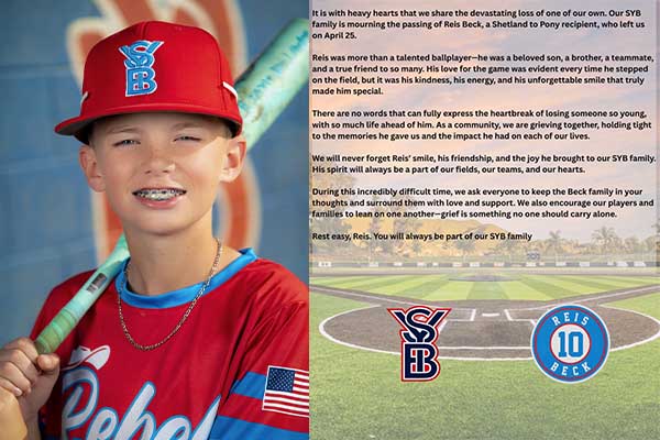 시미밸리 유스 야구 리그는 소셜미디어를 통해 지난 주말 사고로 숨진 리스 벡을 추모하는 글을 게시했다.