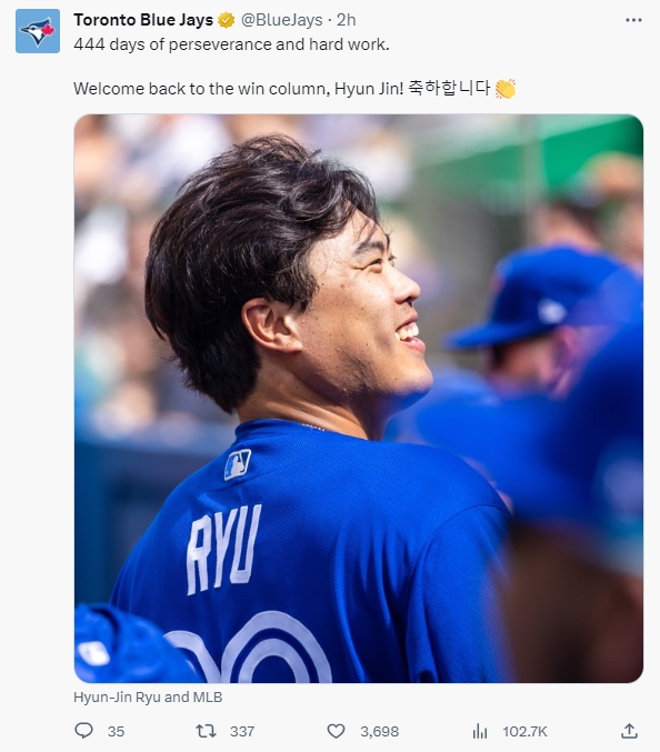 426일 만의 복귀전이었던 지난 2일 볼티모어 오리올스전에서 5이닝 9피안타(1홈런) 1볼넷 3탈삼진 4실점을 기록했던 류현진은 두 번째 등판이던 8일 클리블랜드 가디언스전에서 4이닝 무피안타 1볼넷 2탈삼진 무실점을 작성했다. 강습 타구에 무릎을 맞아 마운드를 내려가기 전까지 깔끔한 호투를 펼치며 부활 기대감을 키웠다.