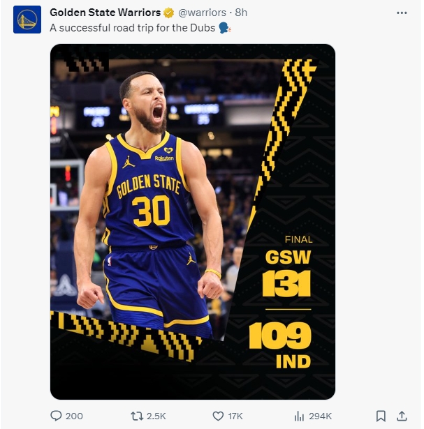 이로써 골든스테이트(24승25패)는 3연승을 달리며 5할 승률에 근접했다. 서부콘퍼런스 11위에 자리했다.