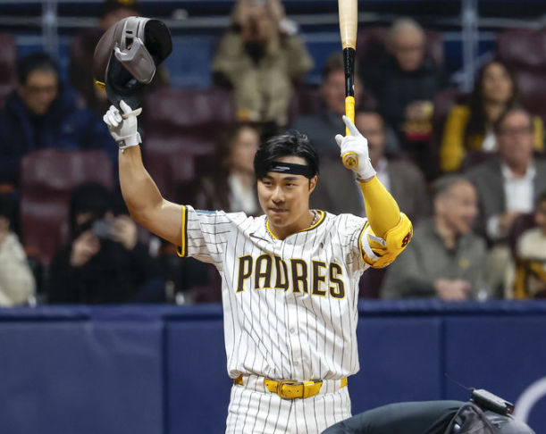 공식 개막전 LA다저스 대 샌디에이고 파드리스 1차전 경기, 2회말 1사 주자없는 상황 타석에 들어선 샌디에이고 김하성이 관중들에게 인사를 하고 있다. 2024.03.20. jhope@newsis.com