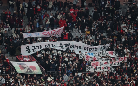 21일 서울월드컵경기장에서 열린 2026 FIFA 북중미 월드컵 아시아 2차 예선 대한민국과 태국의 경기, 대한민국이 1:1 동점으로 경기를 마치자 팬들이 정몽규 대한축구협회장을 향한 항의 현수막을 들고 있다. 2024.03.21.
