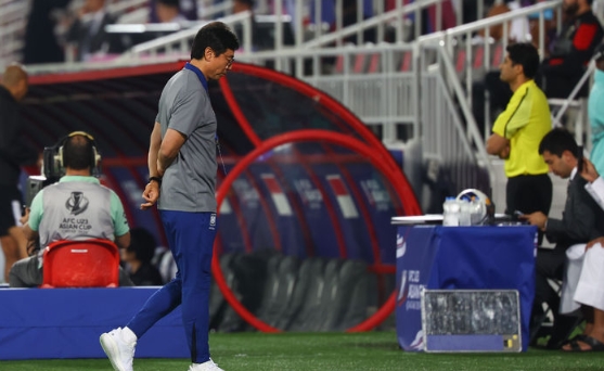 25일(현지시각) 카타르 도하 압둘라 빈 칼리파 스타디움에서 열린 2024 아시아축구연맹(AFC) U-23 아시안컵 8강전 대한민국과 인도네시아의 경기, 전반 한국 황선홍 감독이 인도네시아의 선취골이 들어가자 벤치로 돌아가고 있다. 2024.04.25.