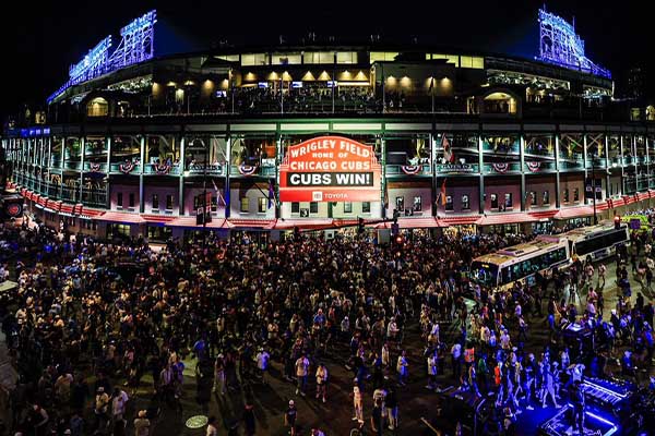 시카고 컵스의 디비전 시리즈행이 확정되자 홈구장인 리글리필드 구장에 모인 팬들이 환호하고 있다. 리글리 필드 X