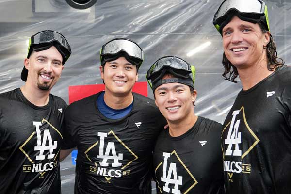 다저스의 선발투수 4인방(블레이크 스넬, 오타니, 야마모토, 글라스노우(왼쪽부터)이 챔피언십시리즈 진출을 축하하고 있다. 다저스 X