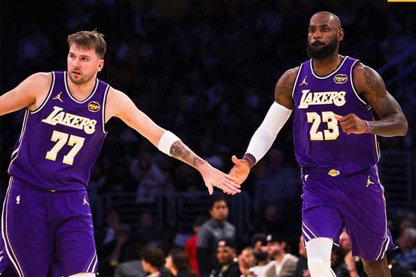 레이커스의 루카 돈치치와 르브론 제임스가 댈러스와의 경기에서 하이파이브를 나누고 있다. 레이커스 X