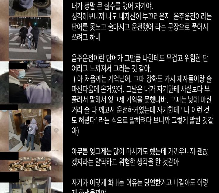 배 씨가 공개한 전 며느리의 학생들과 과도한 음주 후, 부축을 받아 귀가하는 사진과 남학생에게 보낸 문자. (사진출처: 보배드림 캡처) 2025.12.22.