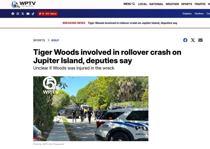 플로리다주 웨스트팜비치 지역 방송국인 WPTV는 이날 오후 2시께 우즈가 주피터섬 도로에서 전복 사고를 당했다고 사진과 함께 보도했다.