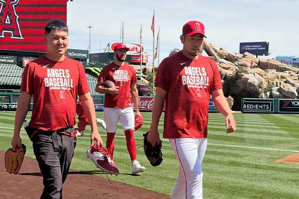 오늘 선발 기쿠치 유세이와 새로운 통역. 연습을 마치고 그라운드를 걷고 있다.