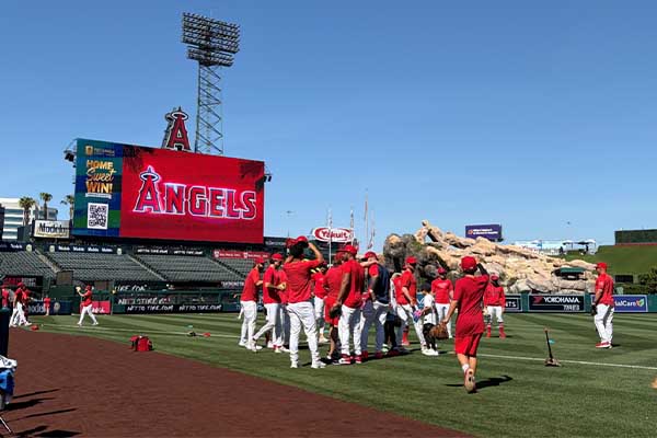 화창한 하늘아래 에인절스 스타디움에서 몸을 풀고 있는 선수들. 석승환
