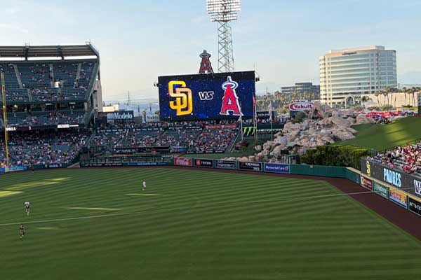 경기 시작 전 에인절 스타디움 전광판에 샌디에고 파드레스와의 2차전 매치업이 표시되고 있다, 여전히 운동장에는 GA, 개릿 앤더슨을 추모하는 글씨가 선명하다. 석승환.