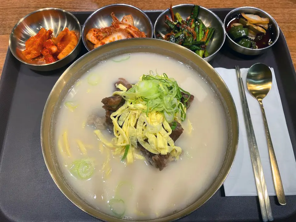 대호갈비찜의 대표 메뉴 중 하나인 갈비 칼국수. 진한 소고기 육수에 칼로 썬 면과 갈비, 계란 지단, 파 고명이 어우러진 한 그릇으로 뉴욕타임스가 ‘강렬하게 위로가 되는 음식’으로 평가했다.사진 출처: Yelp 사용자 Chanmi_L