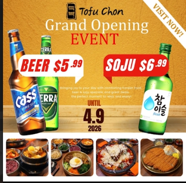 LA 동부 온타리오에서 유명한 두부촌이 LA 코리아타운에 진출했다. 지난 1월27일 2호점 소프트오프닝을 거쳐 지난 3월10일 그랜드 오프닝을 했다. 그리고 리커 라이센스가 나온 기념 이벤트로 4월9일까지 소주 $6.99, 맥주 $5.99로 서비스하고 있다.