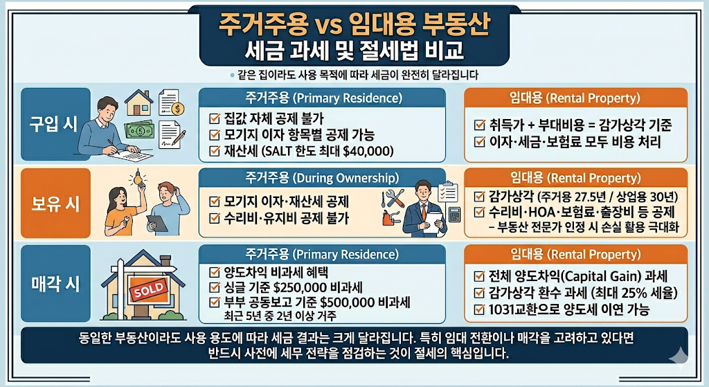 미국에서 부동산을 보유하거나 거래할 때 가장 많이 혼동되는 부분이 바로 ‘주거주용’과 ‘임대용 부동산’의 세금 처리 방식의 차이입니다. 같은 집이라도 사용 목적에 따라 세금 공제와 과세 방식이 완전히 달라지므로 정확한 이해가 필요합니다.