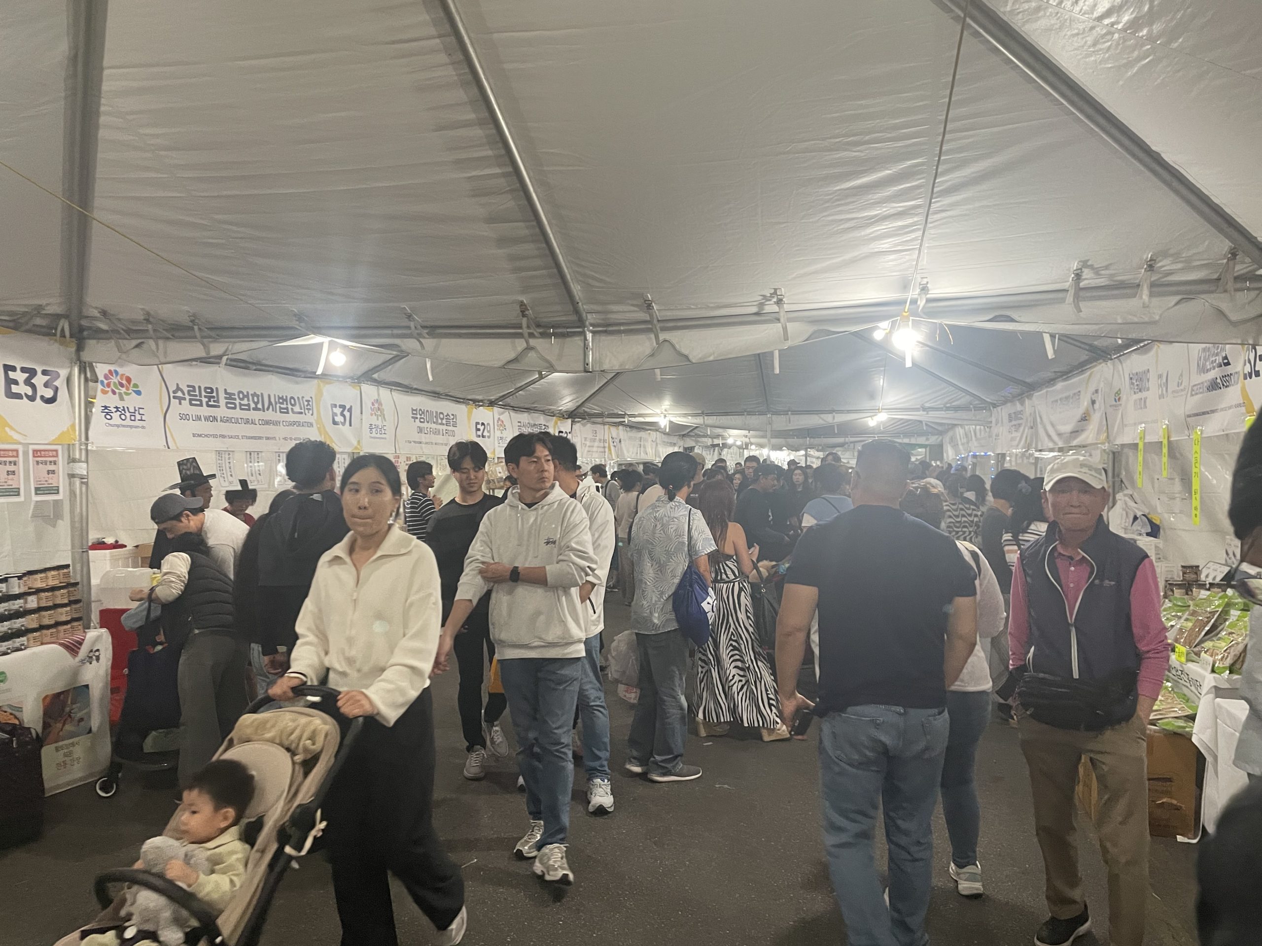 수림원, 부안미소, 충청남도 등 농업단체 부스가 늘어선 엑스포 구역. 가족 단위 방문객과 외국인 관광객들이 북적이는 모습.[K-News LA]