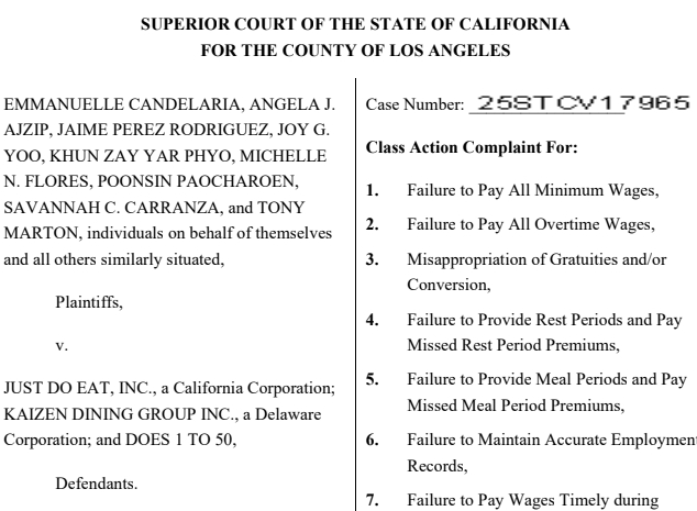 소장에서 이 식당 종업원들은 피고들이 모든 최저 임금 미지급, 모든 초과 근무 수당 미지급, 요구되는 식사 시간 미제공, 법적으로 요구되는 휴식 시간 미제공, 해고 시 임금 미지급, 보고된 팁 미지급, 필수적인 업무 지출 미변제, 병가(Sick Leave) 미지급, 부정확한 서면 급여 명세서 제공 등 캘리포니아 노동법을 10가지 이상 위반했다고 주장했다.