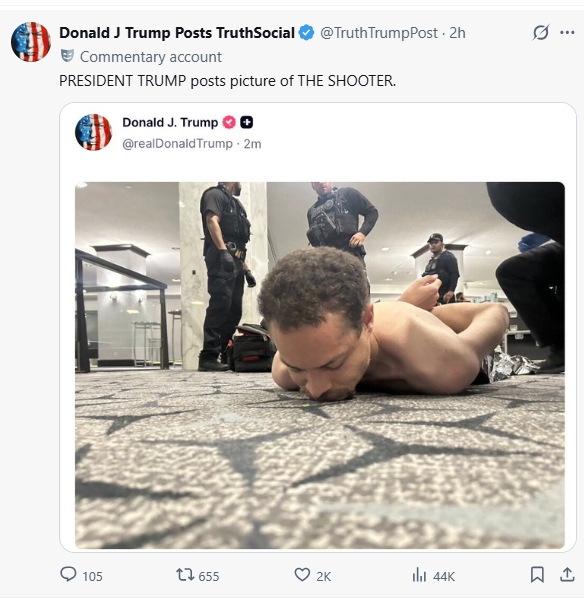 도널드 트럼프 미국 대통령이 25일(현지시간) 워싱턴D.C. 힐튼호텔에서 열린 백악관 출입기자단 연례 만찬에 참석했다가 총격 사건이 발생하자 비밀경호국에 의해 긴급 대피됐다. 사진은 트럼프 대통령이 소셜미디어 트루스소셜에 공개한 용의자 사진. (사진 = 트루스소셜 갈무리)