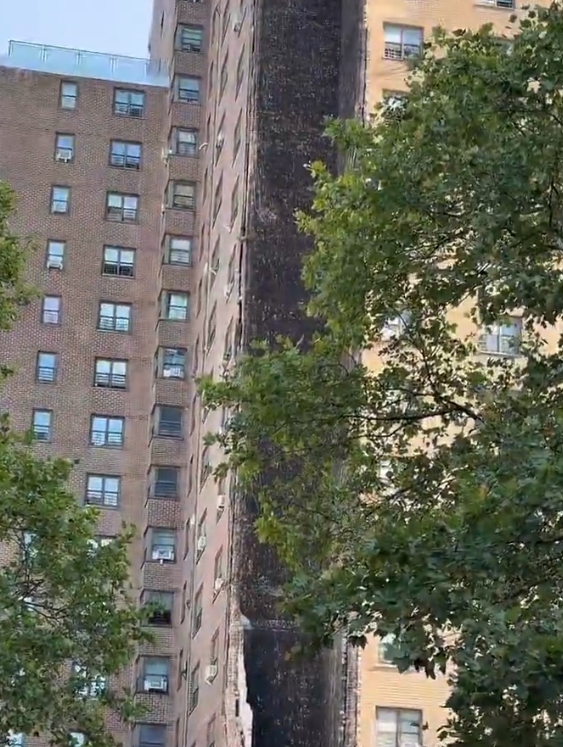 이날 오전 8시 무렵, 뉴욕 브롱크스 소재 한 20층 공공주택 건물 외벽과 연결된 굴뚝(또는 배기 통로)이 폭발과 함께 무너지는 사건이 발생했다. 건물 한쪽 면 전체에 걸쳐 1층부터 최상층까지 이어지는 구조가 심하게 손상된 모습이 포착되었고, 벽돌과 잔해들이 길 위와 놀이터, 인근 보도에 흩뿌려졌다.