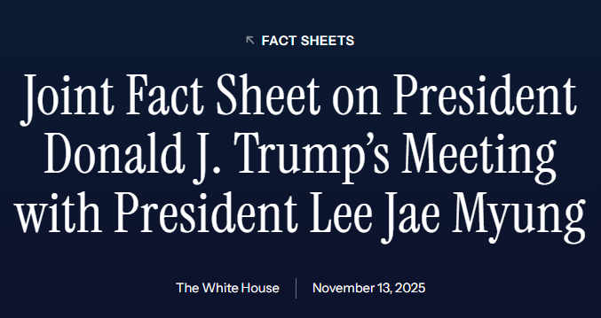 백악관이 도널드 트럼프 대통령 방한을 계기로 열린 한미 정상회담 팩트시트를 공개했다. 한국의 원자력 추진 잠수함 건조 승인 및 관세 인하가 명문화됐다.