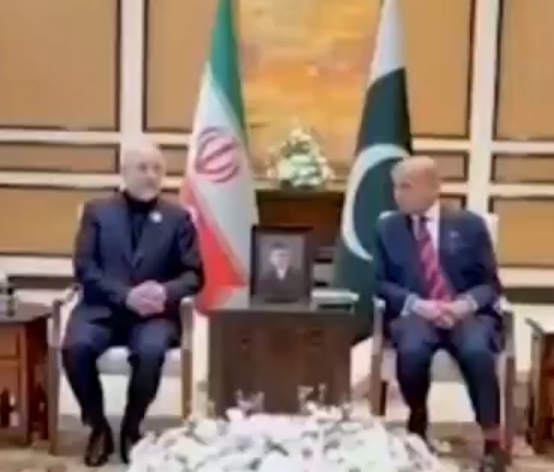 이란의 모하마드 바게르 갈리바프 국회의장과 파키스탄 대통령 **아시프 알리 자르다리(Asif Ali Zardari)**가 마주 앉아 회담을 진행하는 모습.
