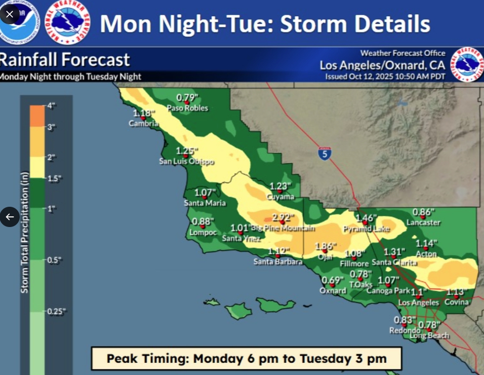 NWS는 이번 비로 인해 앤텔롭밸리 지역은 0.25인치, 샌개브리얼산맥 인근 지역은 최대 3.5인치의 강수량이 예상된다고 밝혔다.