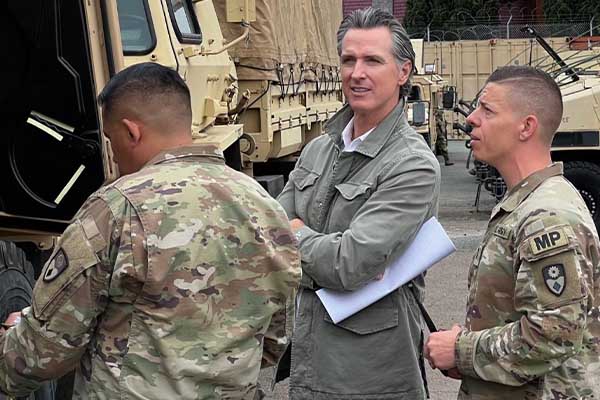 개빈 뉴섬 캘리포니아 주지사가 주 방위군을 방문하고 있다. 캘리포니아 주 방위군