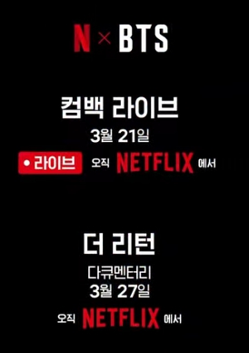 3일 소속사 빅히트 뮤직에 따르면, 방탄소년단이 오는 3월21일 오후 8시(이하 한국시간) 광화문 광장에서 펼치는 BTS 컴백 라이브: 아리랑(ARIRANG)'(BTS THE COMEBACK LIVE|ARIRANG)이 글로벌 OTT 넷플릭스와 협업으로 진행한다.