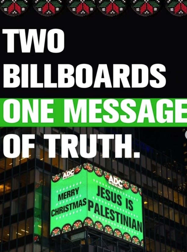 뉴욕의 타임스퀘어 전광판에 “예수는 팔레스타인인(Jesus is Palestinian)입니다”라는 문구가 담긴 대형 광고가 등장해 논란이 일고 있다.