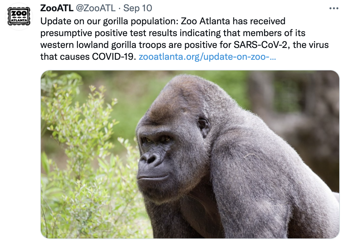 애틀랜타 동물원은 지난 10일 서부지역 출신 고릴라들이 기침과 콧물 등의 증상을 보이고, 식욕을 잃는 등 이상 증세를 보여 코로나 바이러스 검사를 한 결과 양성 판정을 받았다. 이후 추가 실시된 고릴라들 사이에서의 코로나 바이러스 검사에서 18마리가 확진 판정을 받은 것이다.
