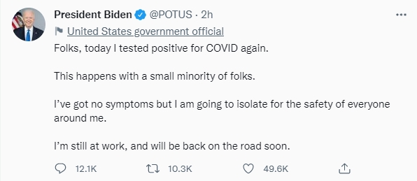 바이든 대통령은 지난 21일 코로나19 오미크론 하위 변이인 BA.5 확진을 받았다. 경증에 팍스로비드 치료를 받았고, 음성 판정을 받은 뒤 27일 격리를 중단했었다.