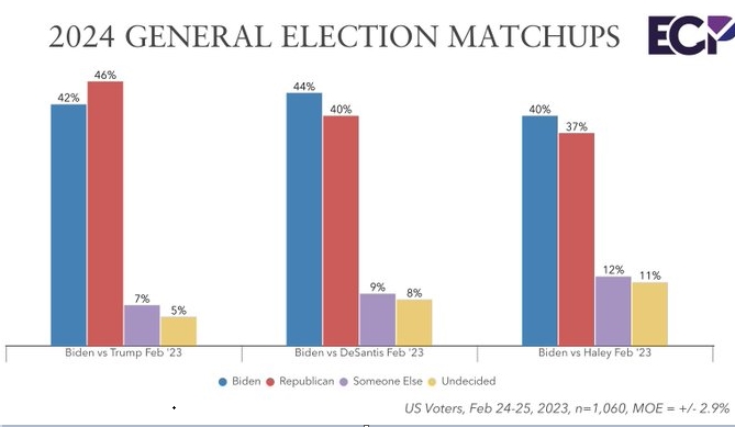 반면 지난해 11월 중간선거 이후 공화당 내에서 트럼프 전 대통령을 대체할 후보로 떠오른 론 디샌티스 플로리다 주지사는 바이든 대통령과 양자대결에서 40% 대 44%로 패배하는 것으로 집계됐다.