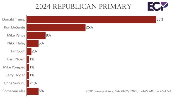 트럼프 전 대통령은 공화당 가상 경선에서도 다른 후보들을 눈에 띄게 앞섰다. 공화당 경선 투표권을 가진 응답자 55%가 트럼프 전 대통령을 후보로 꼽았으며, 디샌티스 주지사는 25%의 지지를 받았다.