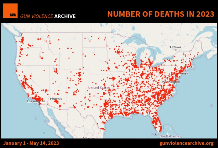 2023년 5월 14일 현재 총기 사망자 발생 현황 지도[gva 홈페이지]