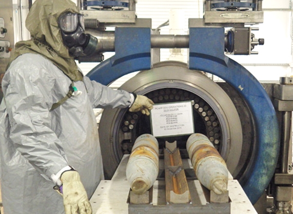 콜로라도주 소재 미 육군 푸에블로 화학무기 창고에서 사람 아닌 로봇 팔이 미국 그리고 세계의 마지막 화학무기를 무해한 금속으로 변환 해체하고 있다.