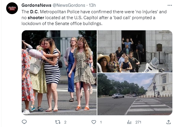 2일 정치전문매체 폴리티코, NBC에 따르면 토마스 맨저 의회 경찰 대장은 이날 오후 2시 30분께 상원 사무실 건물인 하트 빌딩에 총기 난사범이 있다는 911신고를 접수했고 경찰 병력이 현장에 출동했다고 밝혔다.