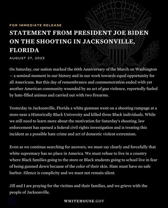 이어 “질과 나는 희생자들과 유족들을 위해 기도하고 있으며, 잭슨빌 사람들과 함께 슬퍼하고 있다”고 덧붙였다.