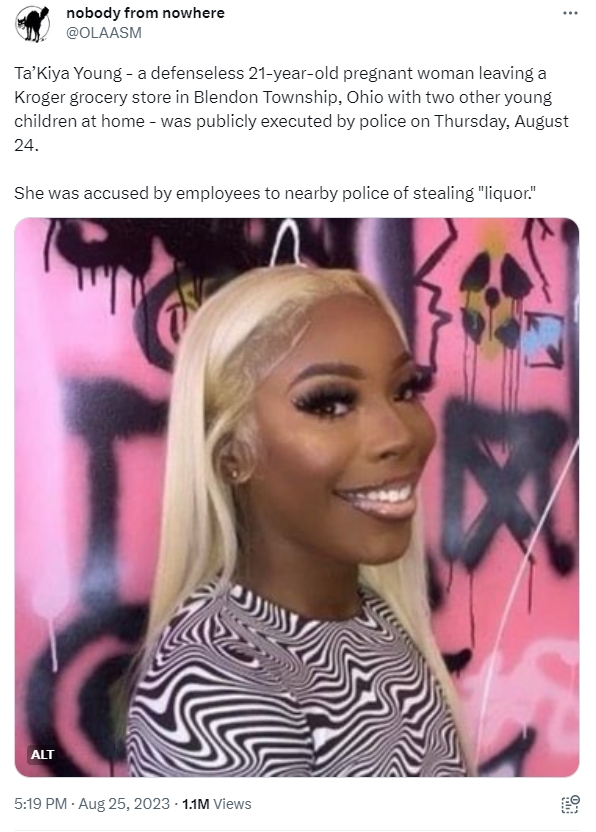 오하이오주의 한 마트 주차장에서 절도 혐의를 받던 20대 임산부가 검문을 피해 도주하려다 경찰의 총격에 사망하는 사건이 발생했다.