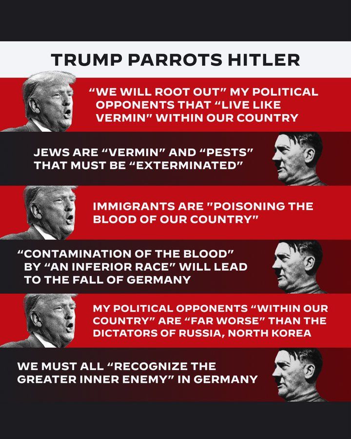 “우리 나라에서 해충처럼 살고있는 정적들을 뿌리 뽑을 것”이라는 트럼프 전 대통령의 발언을 “유대인은 박멸돼야 하는 해충”이란 히틀러의 발언과 함께 세우는 방식이다.