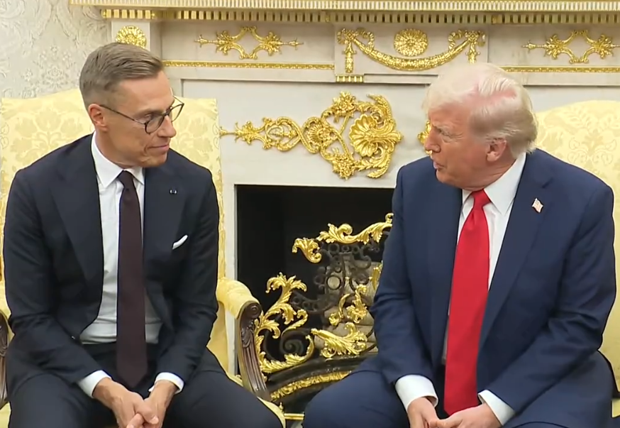 도널드 트럼프 미국 대통령이 9일(현지 시간) 백악관 집무실에서 알렉산데르 스투브 핀란드 대통령과 회담하고 있다